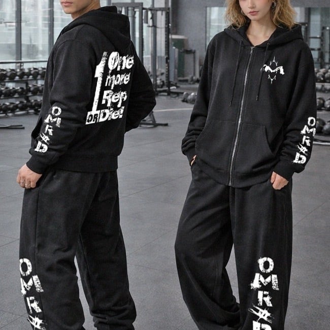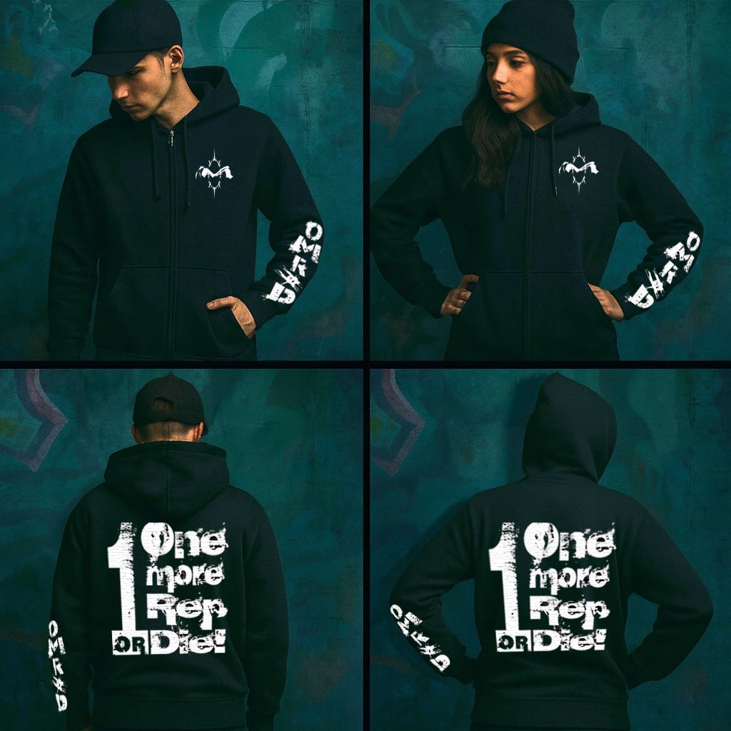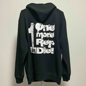 背中に迫力の【もう一発かますか、くたばるかだ】の文言を背負ったジップアップパーカー。