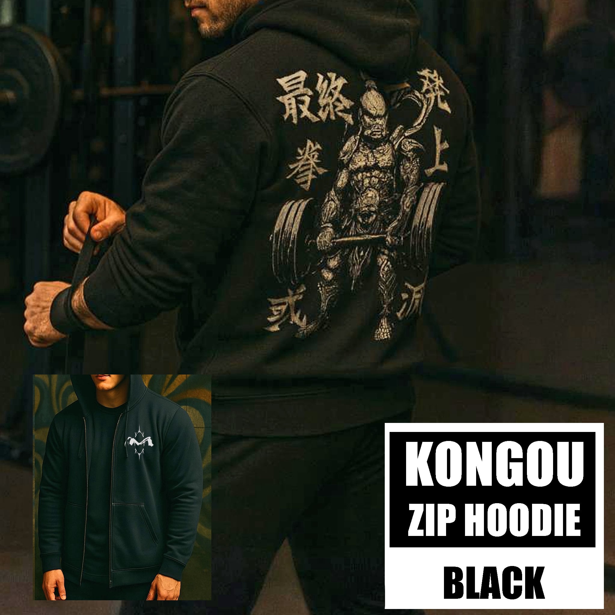 背面に1more Rep or Die【死ぬ気でかませ】の漢字文言の入ったジップアップタイプのパーカー。