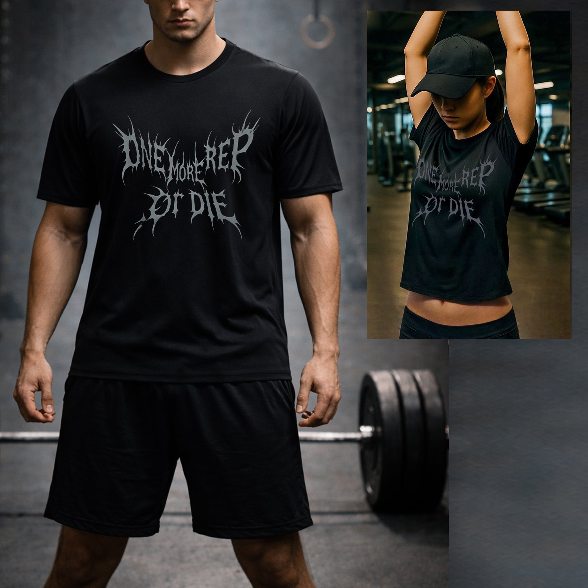 ブラック地にダークグレーで"One more rep or Die”(死ぬ気でかませ)のXスタイルロゴ。