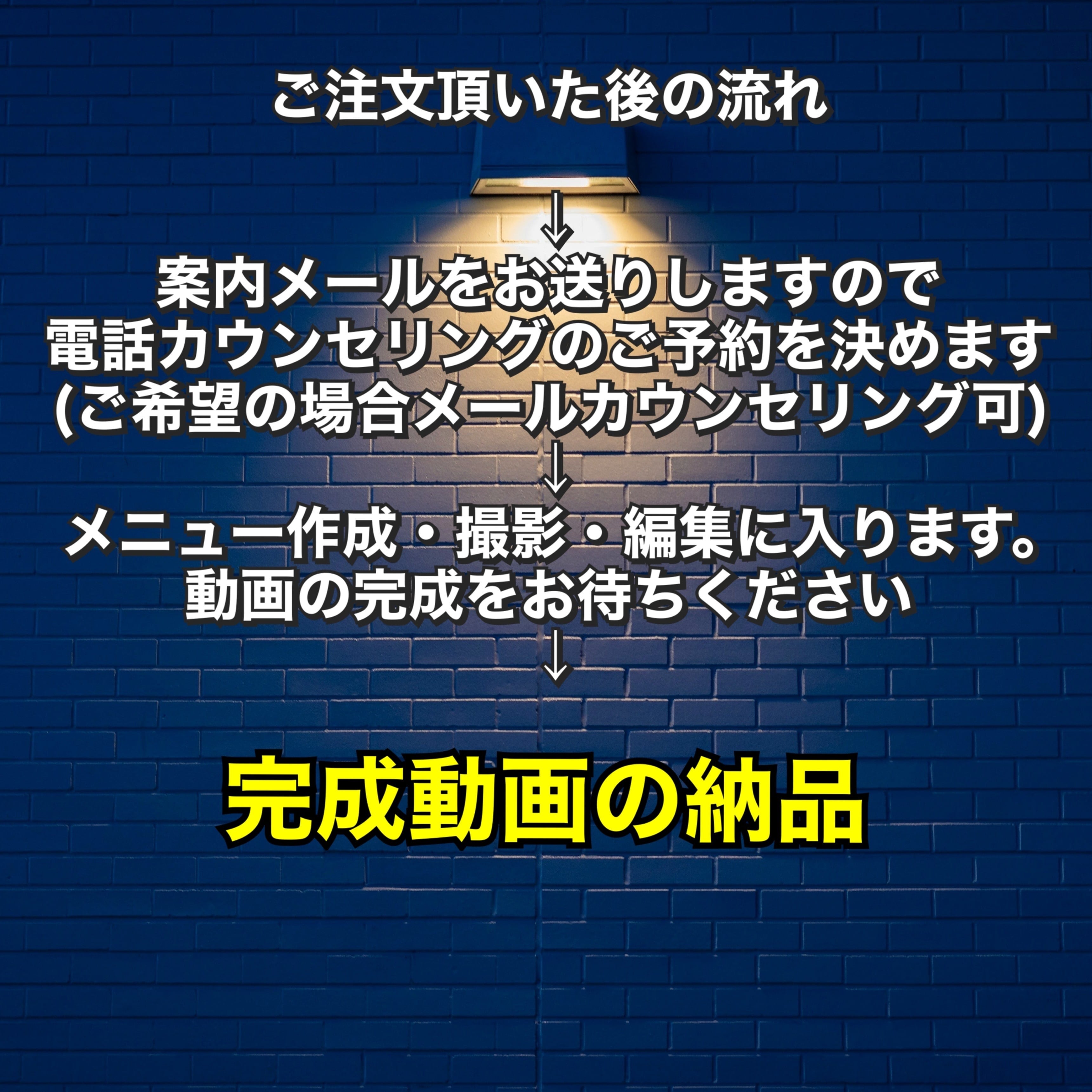 購入後メールでご連絡→お電話でのカウンセリング→あなただけの筋トレ動画教材作成→納品の簡単ステップ。