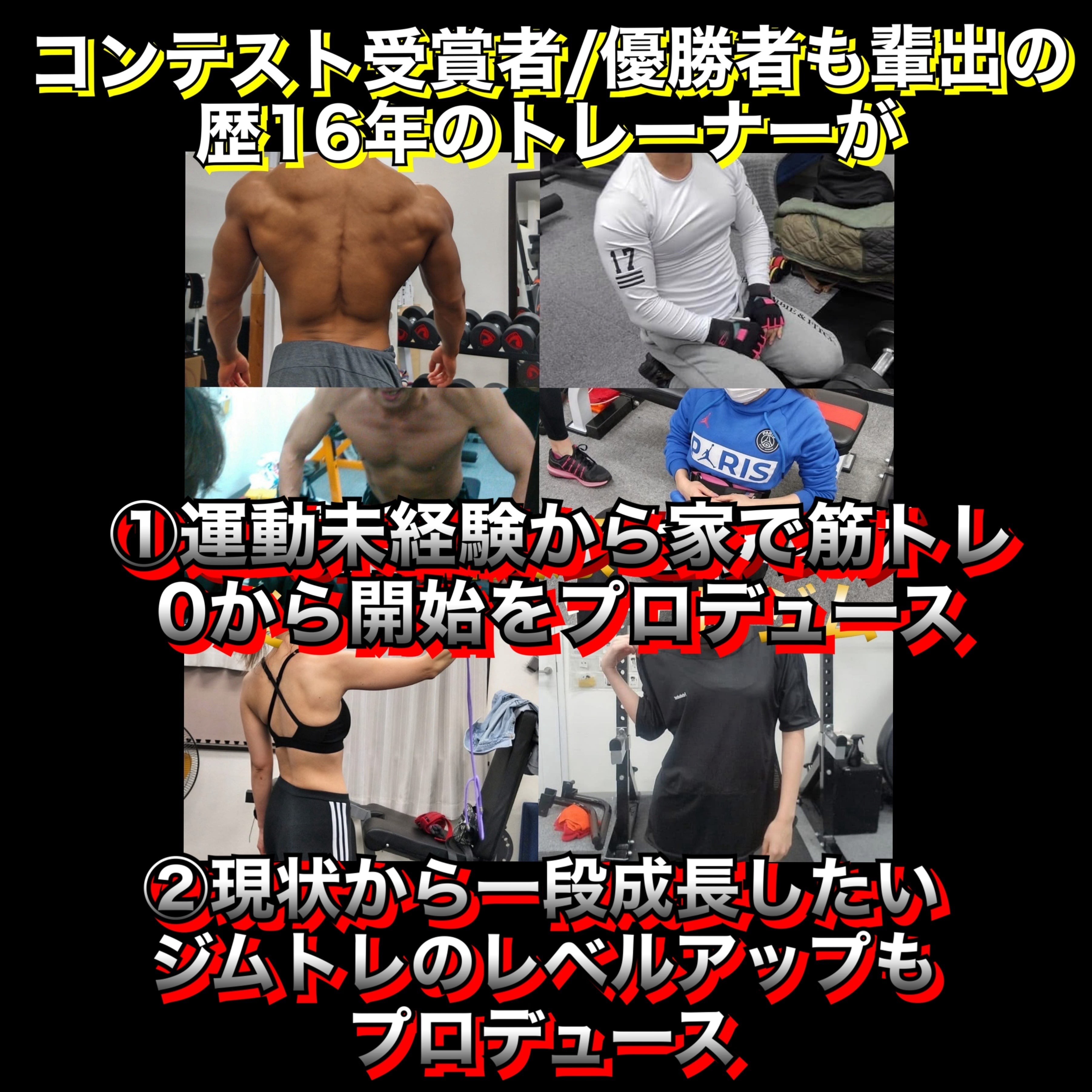 例【全身法60分トレ内容パック】【上半身60分トレ内容パック】【肩DAY60分トレ内容パック】【腕DAY60分内容パック】など、ジムトレ家トレ各々の環境に合わせて提案します。