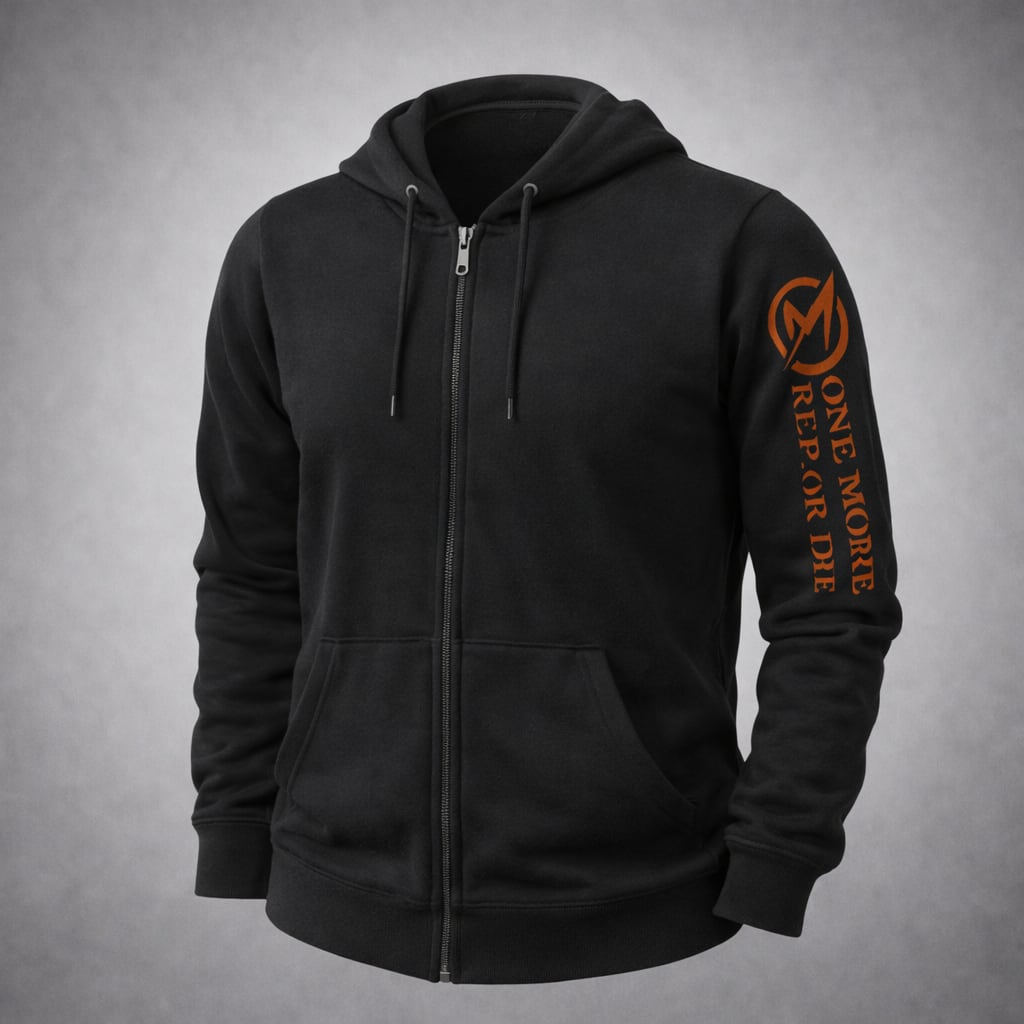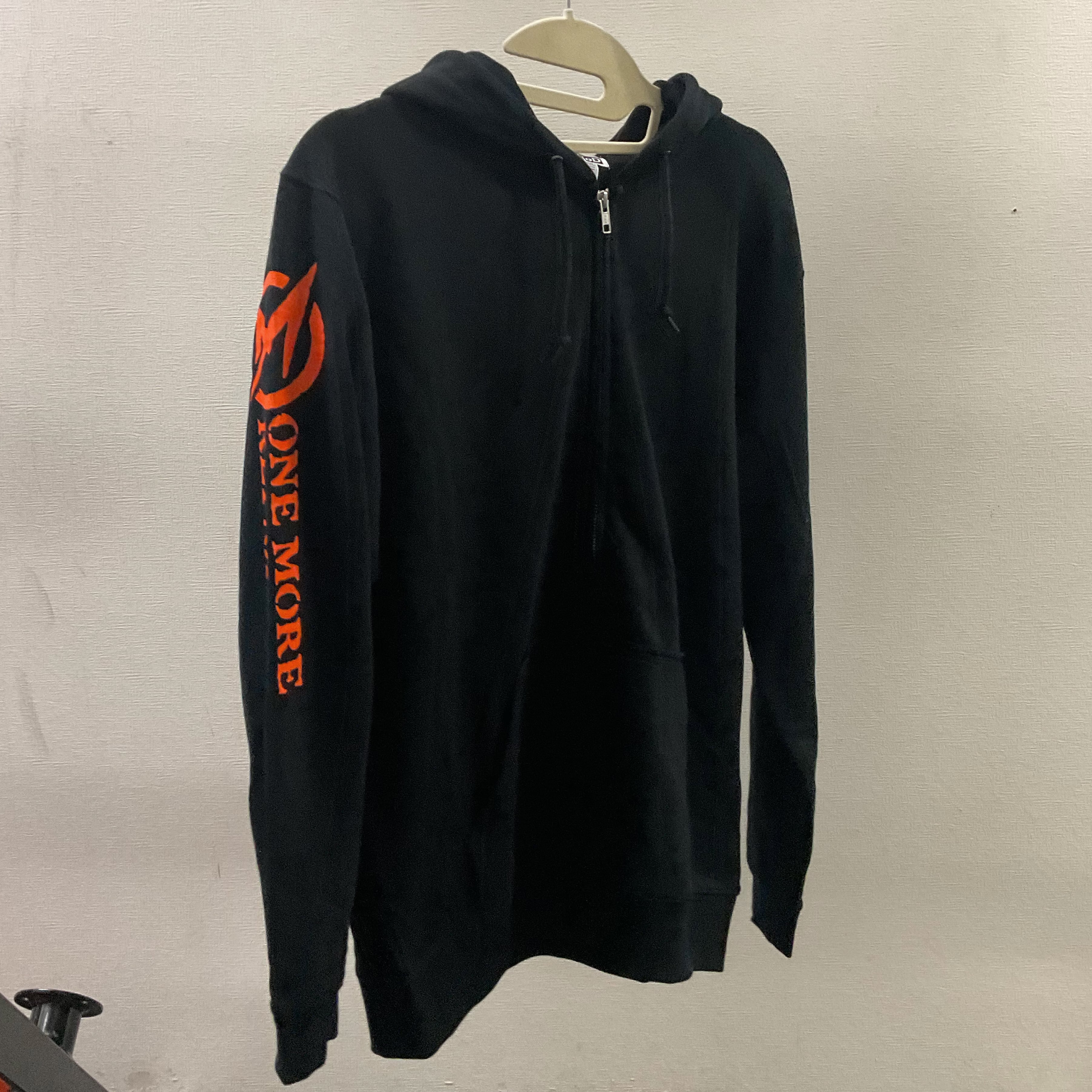 両袖に朱色の【もう一発かますか、くたばるかだ】の文言を入れたジップアップパーカー。